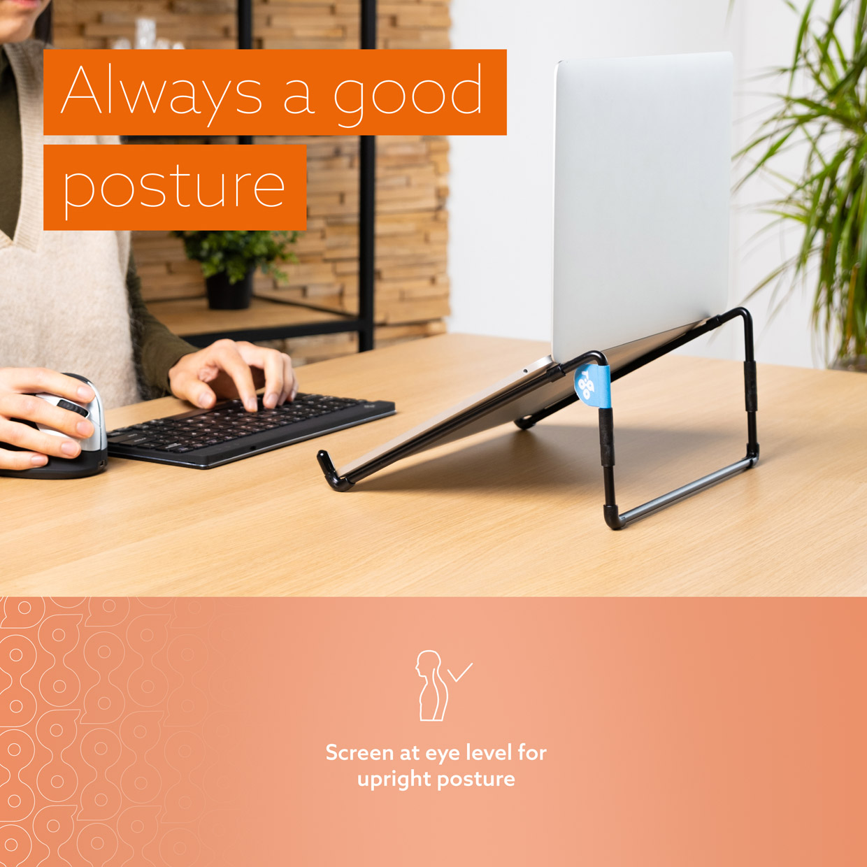 A laptop cannot be properly adjusted to your body. The monitor is not adjustable and the keyboard and mouse are unfavorable to use. As a result, you often work in a hunched posture, causing neck and shoulder pain. So why not get rid of your laptop? No need! With a laptop stand and the right tools, you can still create a healthy workplace.